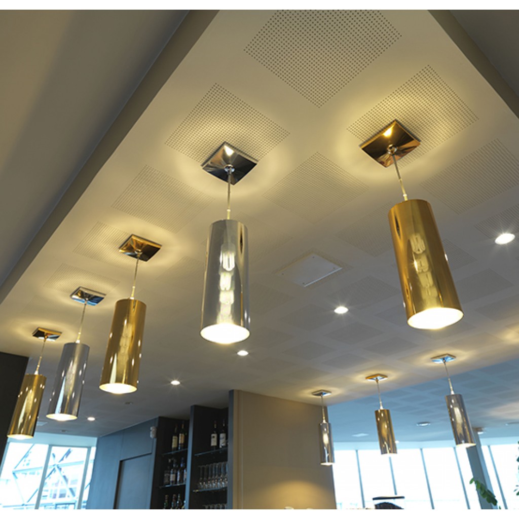 Designpanel is a precision engineered perforated plasterboard made with a gypsum core and heavy duty recycled paper liners. Available in four styles, and with four tapered edges Designpanel is easily installed alongside standard plasterboard.